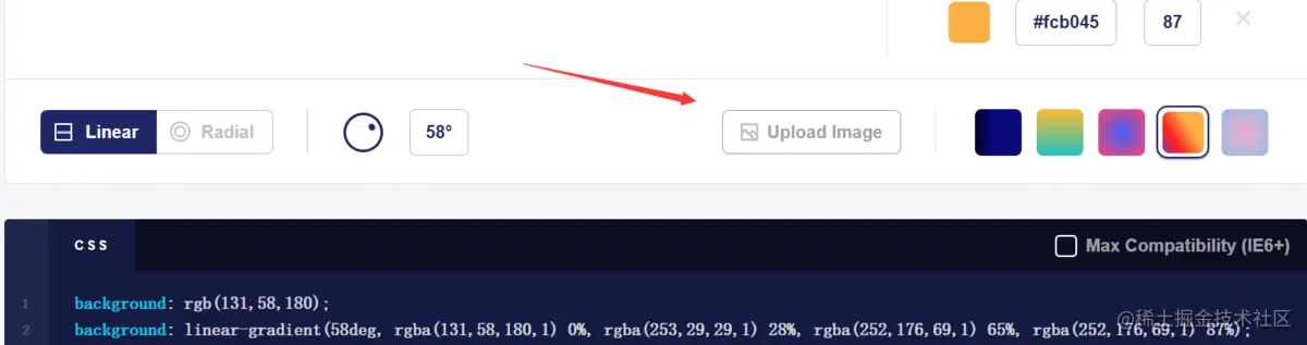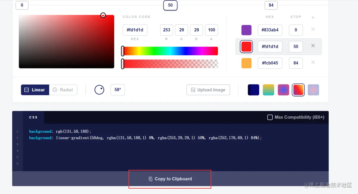 全网最好用的在线生成CSS渐变色工具 一个Bug26 2022-02-26 6,525 阅读1分钟 网址:lingdaima.com/jianbianse/ 做前端和设计经常会需要用到渐变色制作的工具,此款工具是对比了好多之后,功能最强大的一款在线生成工具,操作非常简单。 网址界面如下 点击一键复制CSS代码 支持上传图片自动提取图片渐变色 可随意控制渐变色的数量 还有更多好用的前端工具等你发现 lingdaima.com/