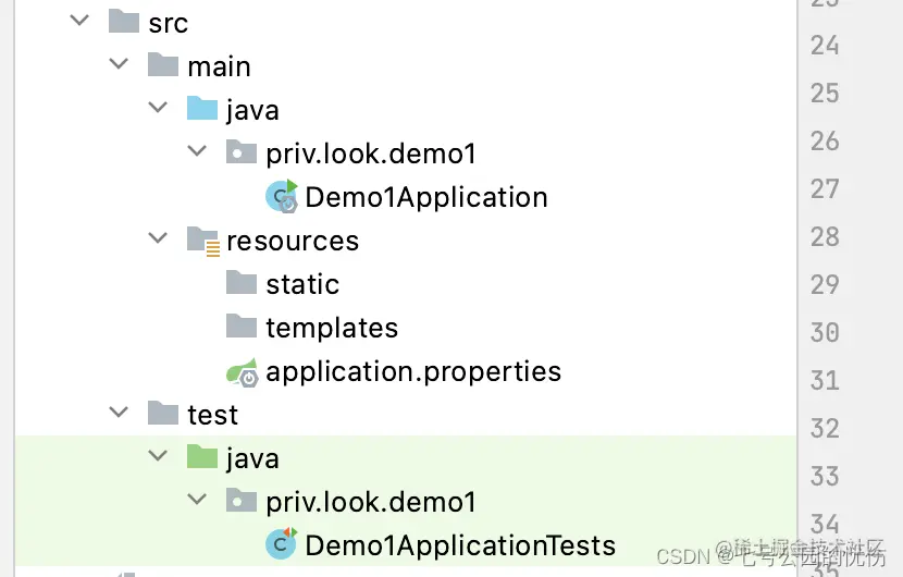 priv.look.demo1使我们创建项目的时候自己设置的,属于root package。我们的主程序类Demo1Application就在该路径下,这也是SpringBoot建议主程序所在的路径。