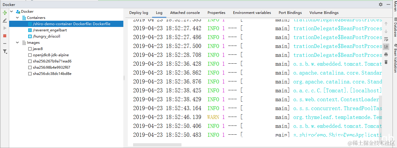 3.回到idea,运行项目,这是ide下部会有docker窗口运行成功后会显示项目启动日志