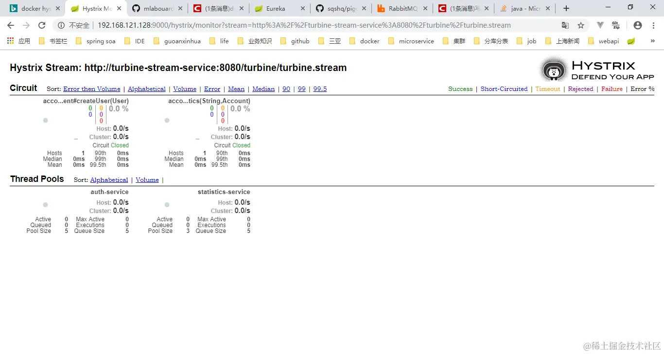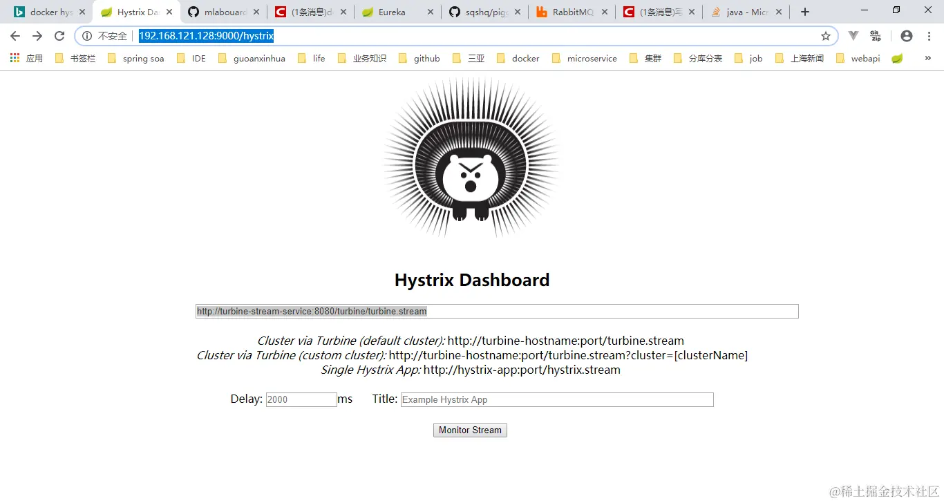 输入http://192.168.121.128:/hystrix 点击访问,访问不到。不知什么原因。restart 容器无效。因为第一次我是把gateway,rabbitmq等端口改掉了。后面重新下载代码采用默认设置。删除容器,镜像重新折腾一遍。还是如此。再折腾了一遍,依然如此。怀疑是网络问题,但是登录到monitoring容器中docker exec -it containerID bash ,执行http://turbine-stream-service:8080/turbine/turbine.stream可以正常看到信息流。说明不是TURBINE-STREAM-SERVICE服务的原因。ping192.168.121.128也可以ping通。通过docker logs piggymetrics_monitoring_1,容器日志信息正常。查看源代码,除了pom就是注解,没有其他代码。??于是bing,bing,bing搜索,最后在github.com/mlabouardy/…,下载了镜像按照说明运行
