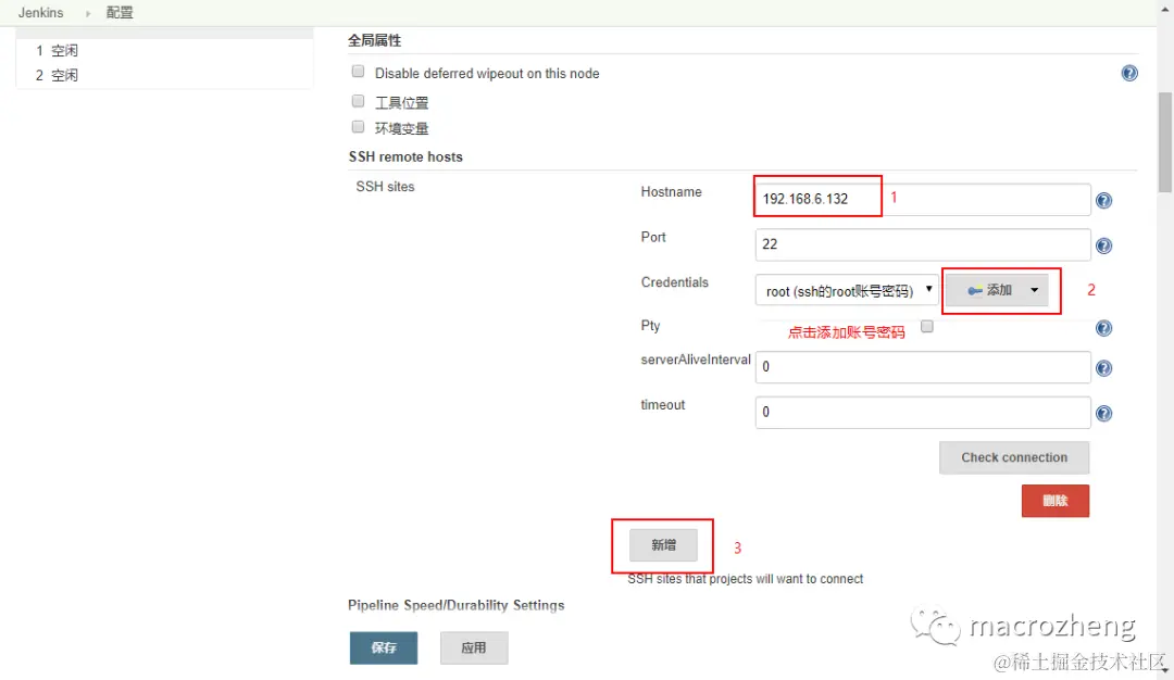 - 4. 在系统管理->系统配置中添加全局ssh的配置,这样Jenkins使用ssh就可以执行远程的linux脚本了: