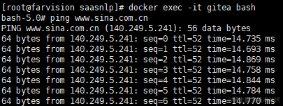 这三条命令,容器就可以访问到了外网,进入gitea容器后ping新浪网可以ping通了,意思就是gitea就可以推送消息到jenkins。