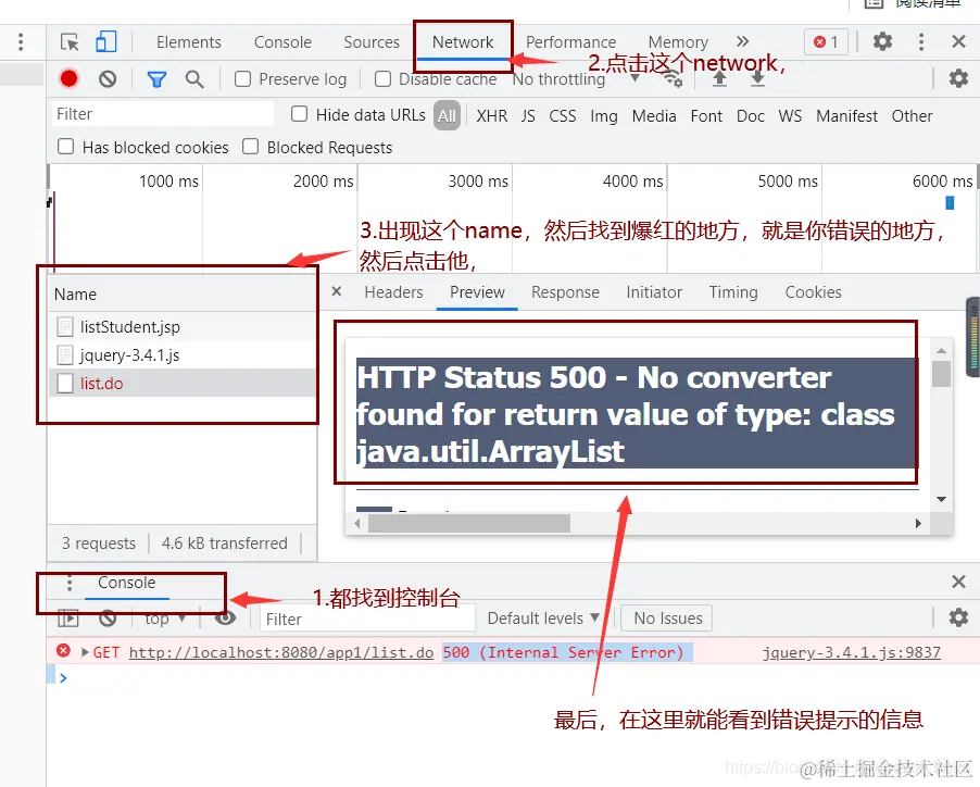今天写Ajax请求然后在服务端出现500 (Internal Server Error)这个错误,在浏览器上也没有找到错误提示,但是经过不断百度,终于找到了