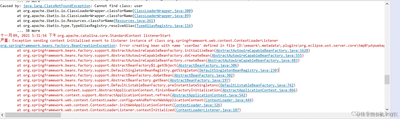 关于org.apache.ibatis.builder.BuilderException mask_boys 2022-02-26 85 阅读1分钟 在还没正式敲代码的时候,就做简单框架界面还是可以出来的。但是今天打算实现登录功能的时候,把所有登录的功能代码都敲上了,运行时就一直404,看了半天代码也不知道错误在那里。后来发现原来是创建对象时有问题。mapper映射文件写错了。 我的实体类的报名是cn.fang.po。但是在mybatis的xml文件中写的是cn.fang.enity 把这两个对上就可以了