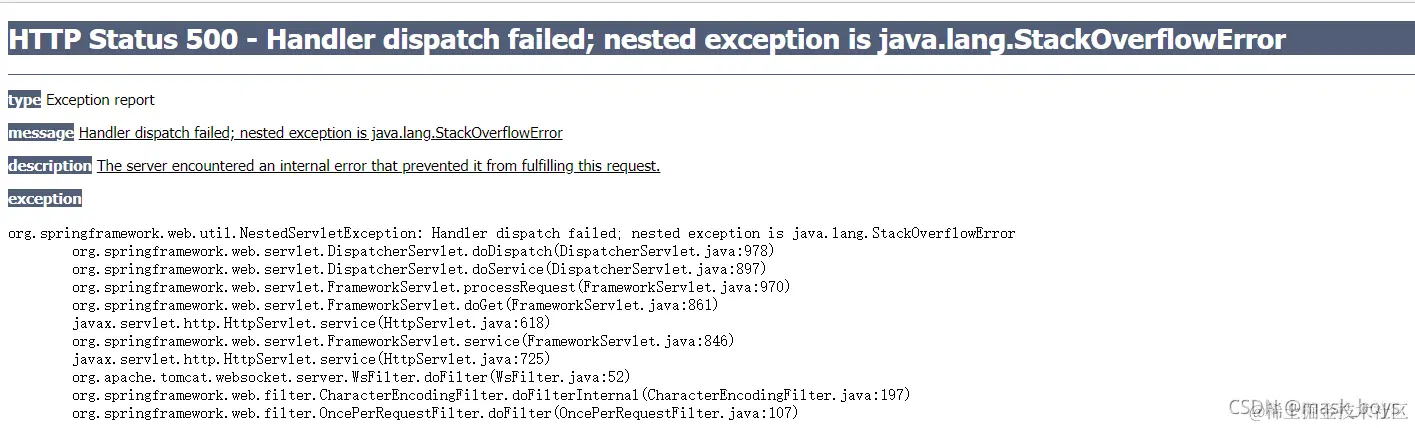 Handler dispatch failed; nested exception is java.lang.StackOverflowError mask_boys 2022-02-26 2,308 阅读1分钟 完成页面的跳转,出现的问题 java.lang.StackOverflowError异常为堆栈异常,查了发现出现这个异常可能有两个原因,一是空间不够,二是自己调用了自己 。 发现自己在持久层中写错了代码