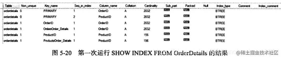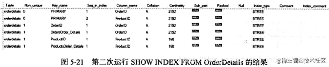 在上述测试过程中,并没有通过 INSERT、 UPDATE这类操作来改变表 OrderDetails中的内容,但是当第二次再运行 SHOW INDEX FROM语句时, Cardinality值还是会发生变化,如图所示。