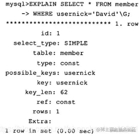 表 member大约有500万行数据。 usemick字段上有一个唯一的索引。这时如果查找用户名为 David的用户,将会得到如下的执行计划: