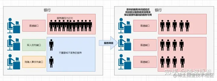 举个例子,在银行中,有很多个服务窗口可以办理业务,其中也有特殊窗口(比如军人优先,残障人士优先的窗口),当银行来了很多人进行办理业务(服务器压力剧增,服务器负载超过了上限阈值),普通窗口已经排了很多人了。这时候,银行会暂时地关闭或延迟特殊窗口的服务,将特殊窗口变成普通窗口来办理所有人的业务,待到银行中办理业务的人不那么多时(下降到上限阈值以下)(将一些不重要或不紧急的服务或任务进行延迟使用或暂停使用),这就是服务降级。