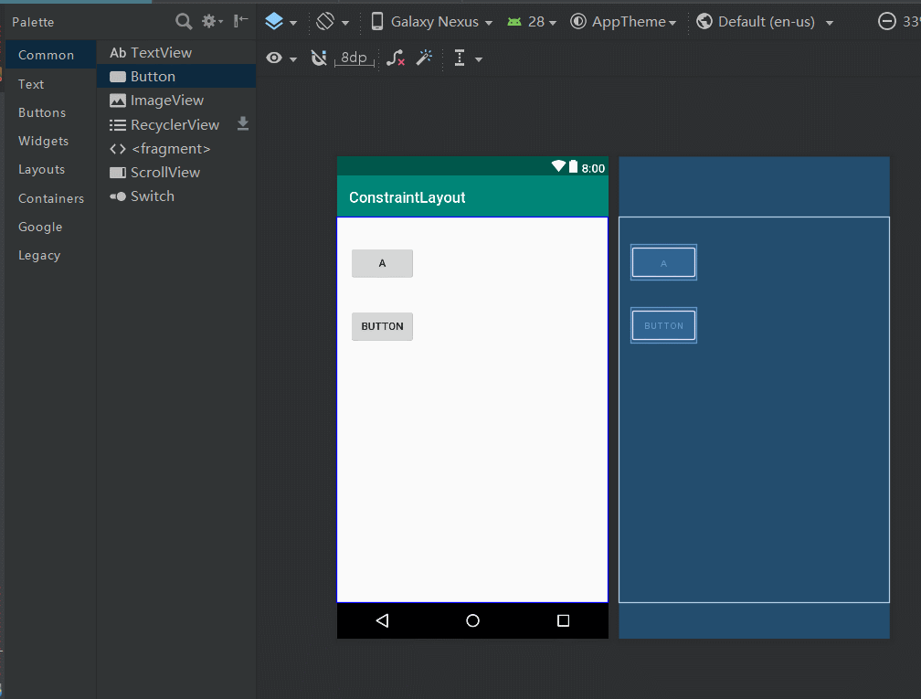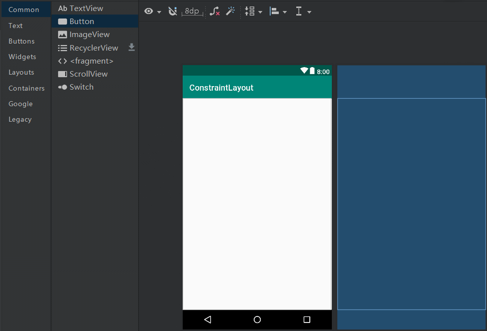 gif图和布局已经很清楚了,Button的上下左右分别与其父控件的上下左右对齐,并默认添加了上下左右分别8dp的margin。需要说明的是,当控件A相对方向(上下或左右)都基于其他位置对齐,那么控件A会默认置于剩余空间的中间位置(如上图)。