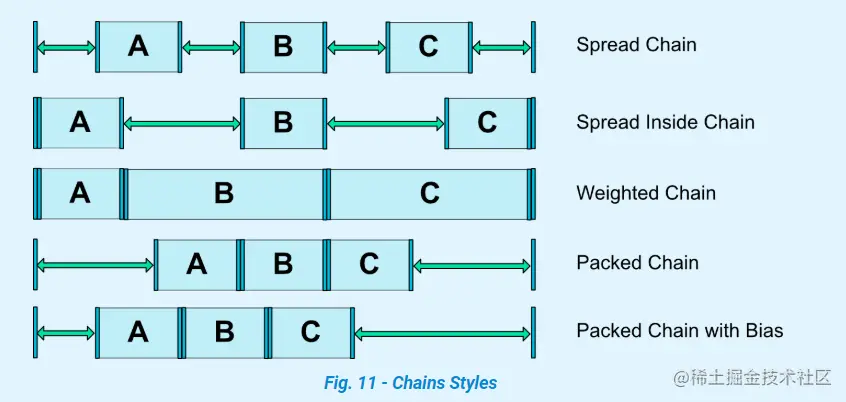 Chain的第一个控件(最左或最上)成为链头,可以为链头设置layout_constraintHorizontal_chainStyle属性来影响整个链的分布。