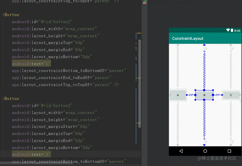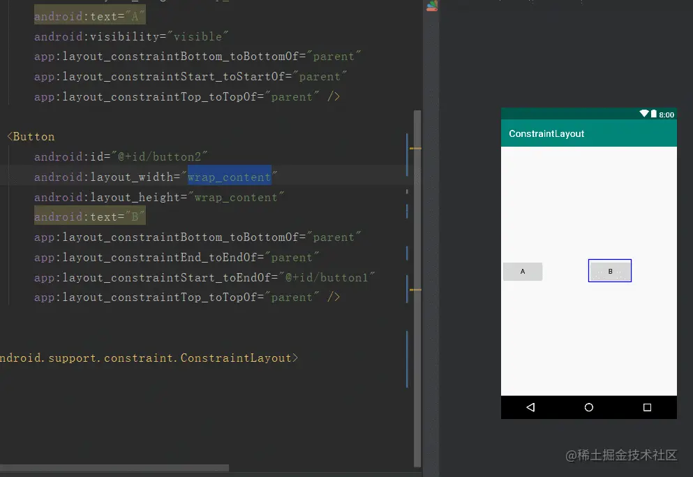 可以看到Button B的左右约束超出了原有范围失效了。这时候需要设置constrainedWidth要求控件必须遵循约束条件。