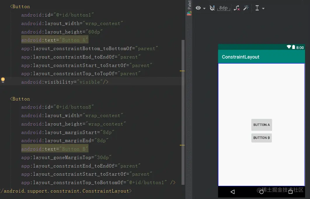 因为设置了goneMarginTop="30dp",当Button A设为gone时,Button B的位置完全没有变化。