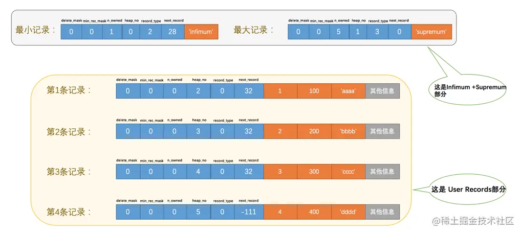 这两条记录 不是我们自己定义的记录 ,所以它们并不存放在页的User Records部分,他们被单独放在一个称为Infimum + Supremum的部分,如图所示: