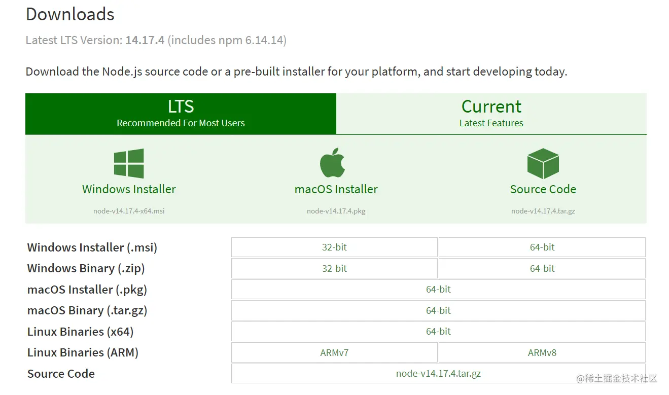 - 你可以根据不同平台系统选择你需要的 Node.js 安装包