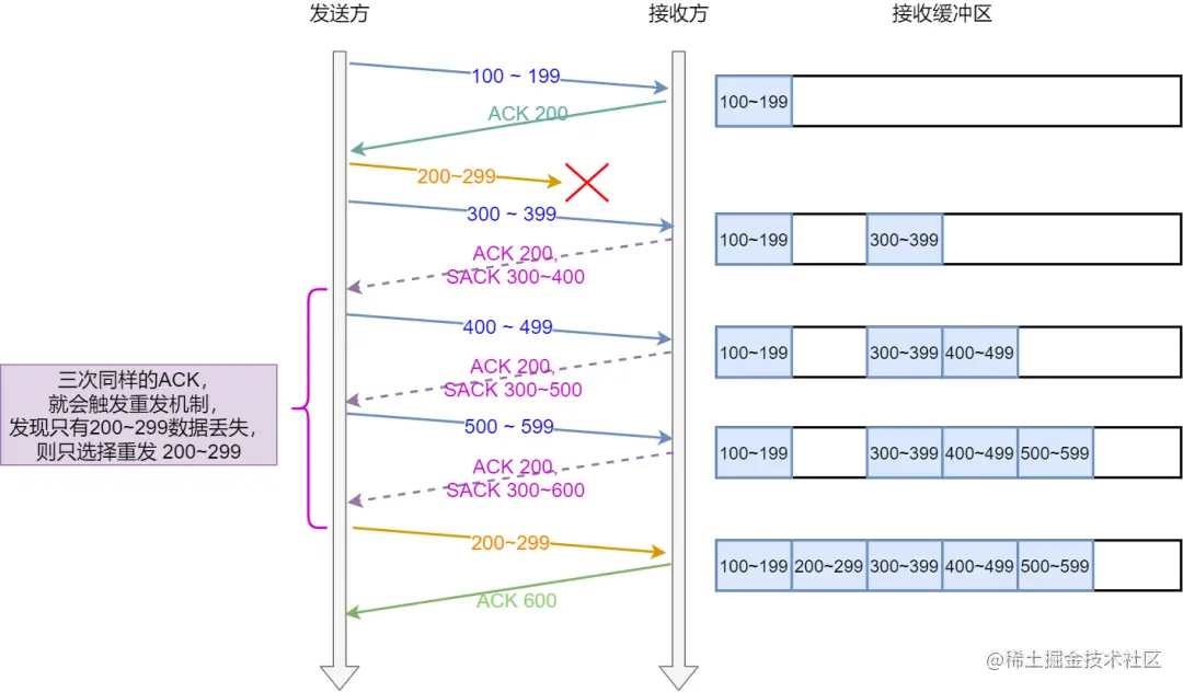如下图,发送方收到了三次同样的 ACK 确认报文,于是就会触发快速重发机制,通过 SACK 信息发现只有 200~299 这段数据丢失,则重发时,就只选择了这个 TCP 段进行重复。
