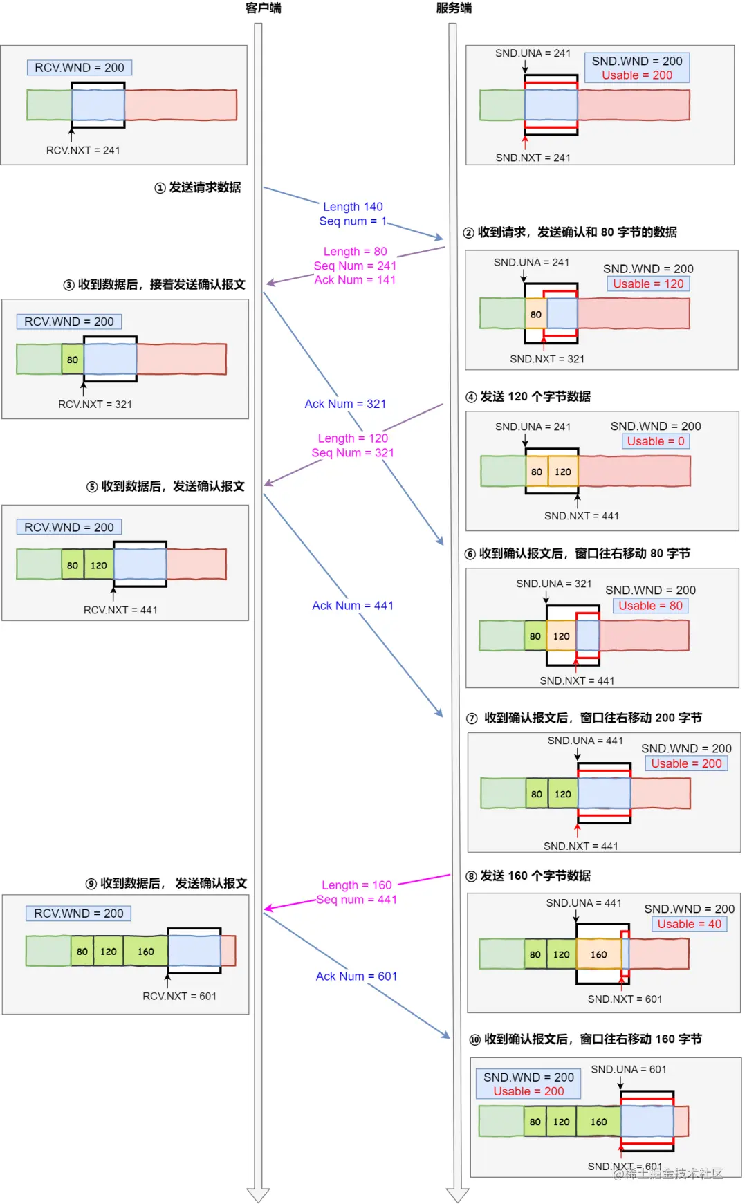 我们在前面提到过发送窗口 swnd 和接收窗口 rwnd 是约等于的关系,那么由于入了拥塞窗口的概念后,此时发送窗口的值是swnd = min(cwnd, rwnd),也就是拥塞窗口和接收窗口中的最小值。