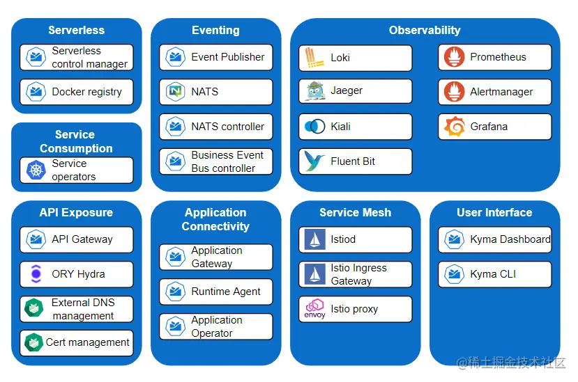 Kyma 建立在领先的云原生开源项目之上,例如 Istio、NATS、Serverless 和 Prometheus。 Kyma 开发的功能是将它们粘合在一起的独特“粘合剂”,因此开发人员可以轻松直观地连接和扩展应用程序。