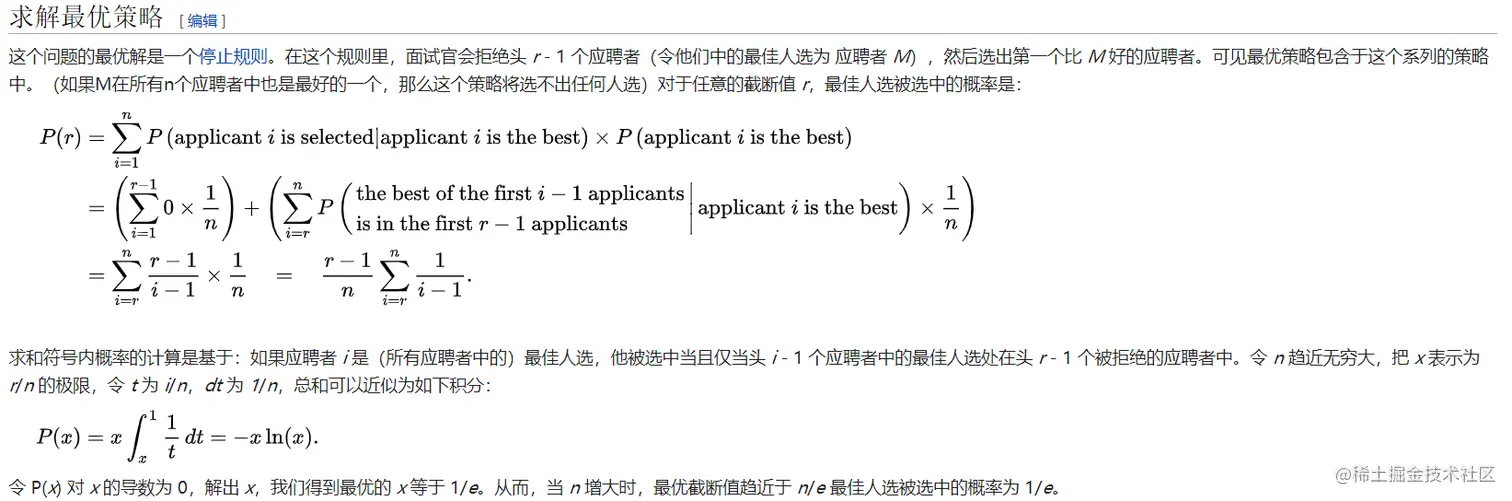 这个问题的原型叫秘书问题,可以在维基百科上查到,内容是这样的:要聘请一名秘书,有 n 个应聘者。每次面试一人,面试后就要及时决定是否聘他,如果当时决定不聘他,他便不会回来。面试后总能清楚了解应聘者的合适程度,并能和之前的每个人做比较。问什么样的策略,才使最佳人选被选中的概率最大。