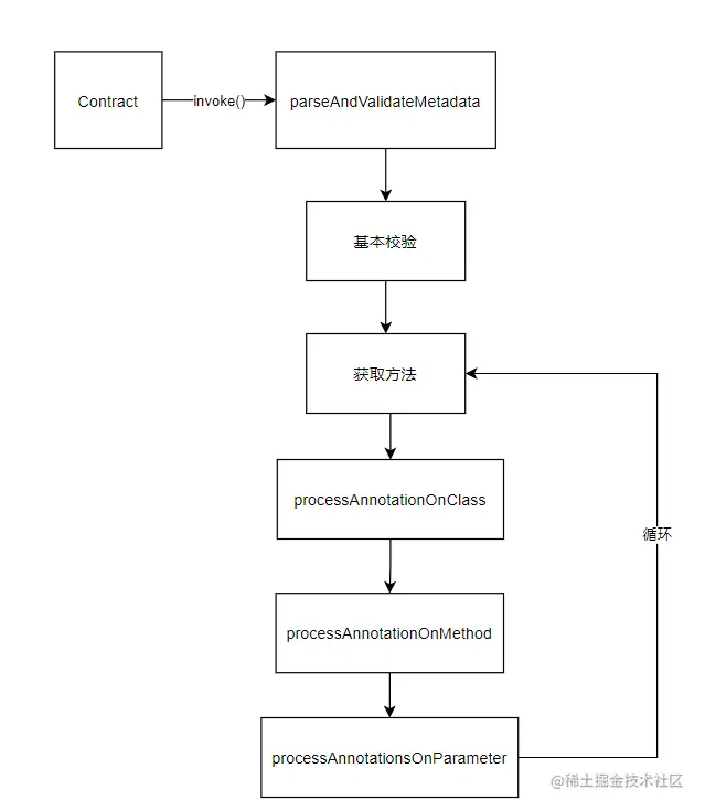 通过这几个方法,对于Contract接口的职责大概已经了解。首先传入接口Class,调用parseAndValidateMetadata获取基本信息,然后依次调用上面3个方法解析类、方法、参数上的注解。通过这套解析流程,我们也能定义自己的注解进行解析了。
