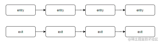 这两个方法的调用逻辑也如同上图,在开始时顺着链路执行entry方法,在结束时顺着链路执行exit方法