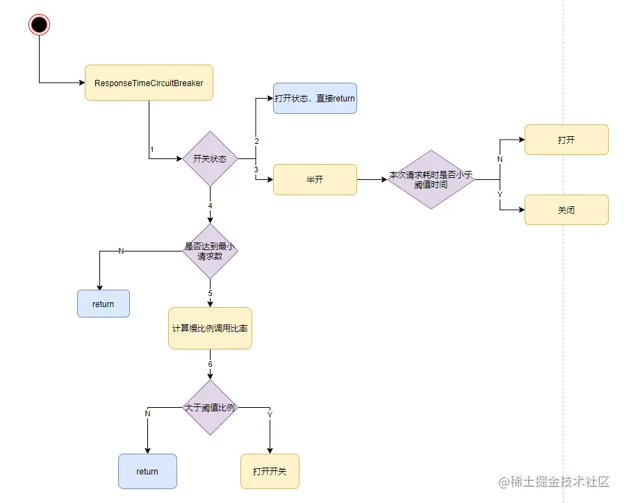 如果是比例阈值的话,那么就需要计算出(慢比例调用数 / 总请求数数) <= 比例阈值,如果不是的话,那么就需要打开我们短路器的开关了