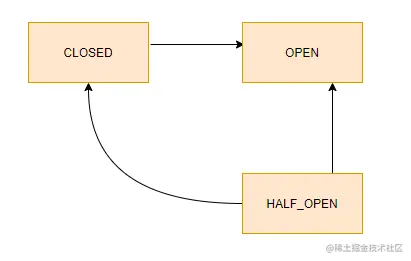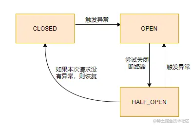接着让断路器继续打开还是说进行恢复呢?所以才有半开这个中间状态,来判断是否让熔断继续,如果尝试调用恢复了正常,那么就会让断路器关闭,否则打开