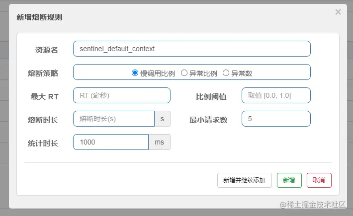 当我们一个请求超过预计响应时长时,有可能只是该请求出了问题而别的请求并未产生问题,所以只有当一定比例的请求都发生问题时,才会产生熔断。Sentinel中可以配置比例阈值来判断当请求超时数达到多少时才会进行熔断。不过该值仅在慢比例策略下生效