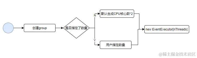 可以看到group并没有指定EventExecutor入参,那么group里的数组执行器则是在类创建的时候就应该默认帮我们创建好了,之前说过group的模板逻辑都在MultithreadEventLoopGroup中,在该类中找到了初始化group的方法。对于执行器数组的大小如果指定了则使用我们设置的,没指定就用netty通过cpu核心数获取,大概流程如下