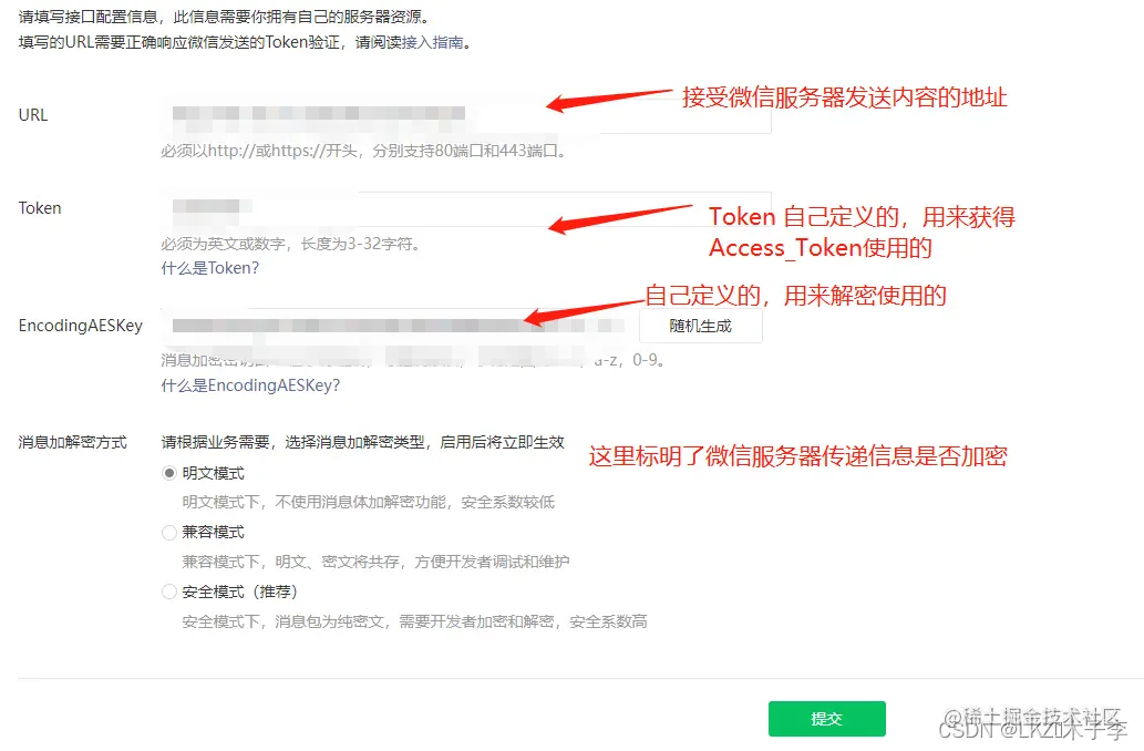 EncodingAESKey: 加密密钥,微信回通过这个密钥把数据加密后,把数据传送给自己的服务器,自己的服务器需要通过这个密钥加密(前提是开启了安全模式),如果是明文模式不需要使用加密加密