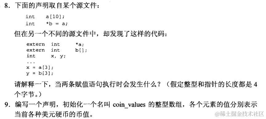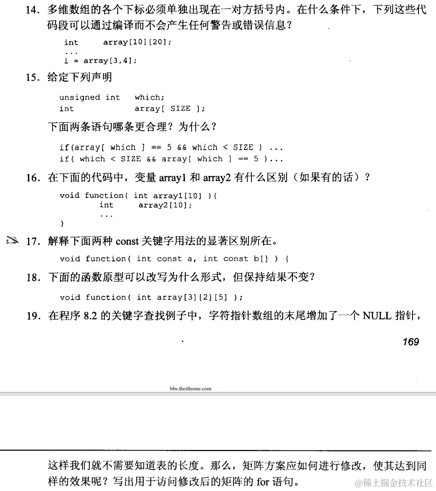 - 16.有几个不同点。作为一个参数,array1实际上是一个指针变量;它指向作为实际参数传递的数组,它的值可以由函数更改。在这个函数中没有为这个数组分配空间,也不能保证实际传递的参数有10个元素。另一方面,array2是一个指针常量,所以它的值不能更改。它指向函数中为10个整数分配的空间