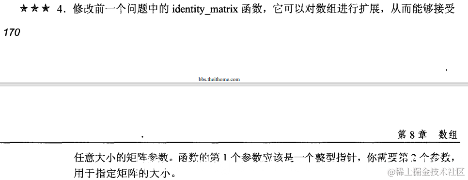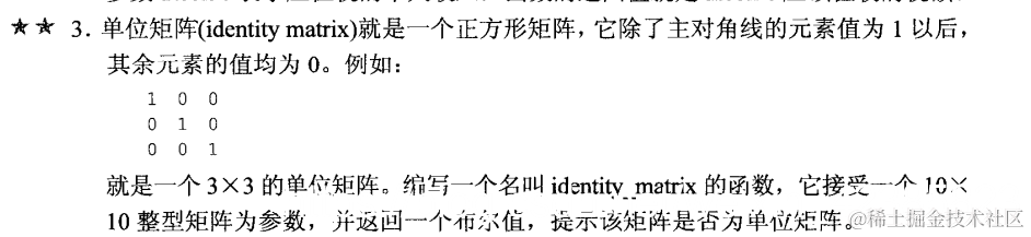 #include<stdio.h> int indentity_matrix(int matrix[][],int size) { int row=0; int column = 0; //遍历每个元素 for (row = 0; row < size; row += 1) { for (column = 0; column < size; column += 1) { if (matrix[row][column] != (row == column)) return false; } } return true; } -