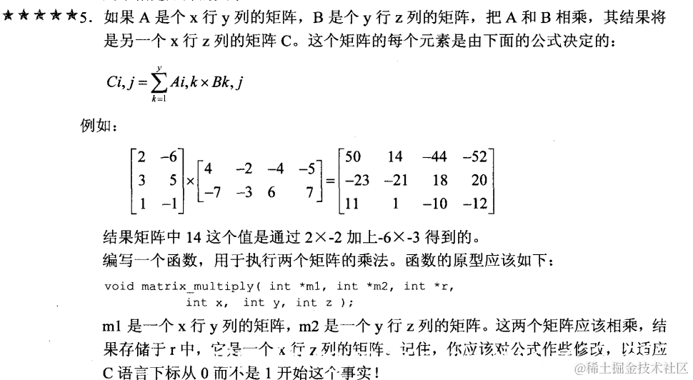 #include<stdio.h> void matrix_multiply(int *m1, int *m2, int r, int x, int y, int z) { int *m1p; int *m2p; int k; int row; int column; for (row = 0; row < x; row++) { for (column = 0; column < z; column++) { m1p = m1 + row * y;//选择第一个矩阵的第几个元素的地址 m2p = m2 + column;//选择第二个矩阵的第几个元素的地址 r = 0; for (k = 0; k < y; k++) { r += *m1p * *m2p;//*解析地址,取出该地址的值 m1p+=1;//取下一个地址值 m2p+=z; } printf("%d\n", r); } } } int main() { int A[][2] = { {2,-6},{3,5},{1,-1} }; int B[][4] = { {4,-2,-4,-5},{-7,-3,6,7} }; int r = 0; matrix_multiply(*A,*B, r, 3, 2, 4); return 0; }#define X 3 #define Y 2 #define Z 4 void matrix_multiply2(int matrix_a[X][Y], int matrix_b[Y][Z]) { int matrix_result[X][Z]; for (int m = 0; m < X; m++) { for (int s = 0; s < Z; s++) { matrix_result[m][s] = 0;//变量使用前记得初始化,否则结果具有不确定性 for (int n = 0; n < Y; n++) { matrix_result[m][s] += matrix_a[m][n] * matrix_b[n][s]; } } } for (int m = 0; m < X; m++) { for (int s = 0; s < Z; s++) { printf("%d\t", matrix_result[m][s]); } printf("\n"); } } int main() { int A[][2] = { {2,-6},{3,5},{1,-1} }; int B[][4] = { {4,-2,-4,-5},{-7,-3,6,7} }; int r = 0; //matrix_multiply(*A,*B, r, 3, 2, 4); matrix_multiply2(A, B); return 0; }