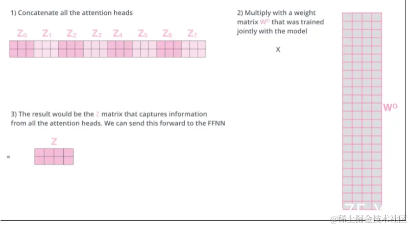 前馈神经网络没法输入 8 个矩阵呀,这该怎么办呢?所以我们需要一种方式,把 8 个矩阵降为 1 个,首先,我们把 8 个矩阵连在一起,这样会得到一个大的矩阵,再随机初始化一个矩阵和这个组合好的矩阵相乘,最后得到一个最终的矩阵。