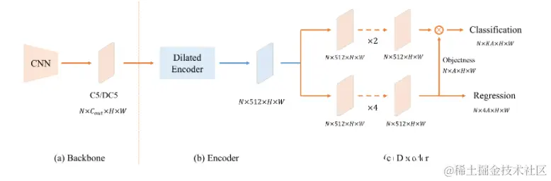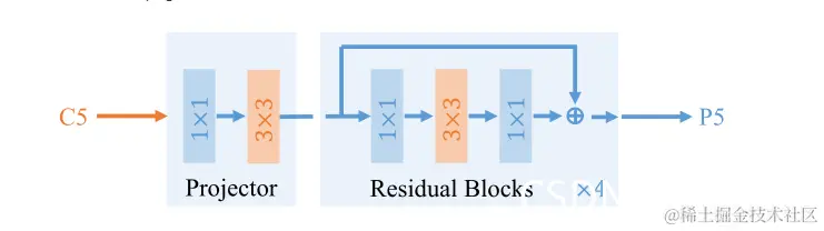Dilated Encoder。它包含两个主要组件:Projector 和 Residual Blocks。投影层首先应用一个 1×1 卷积层来降低通道维度,然后添加一个 3×3 卷积层来细化语义上下文,这与 FPN [22] 中的相同。之后,我们在 3×3 卷积层中堆叠四个具有不同扩张率的连续扩张残差块,以生成具有多个感受野的输出特征,覆盖所有对象的尺度。