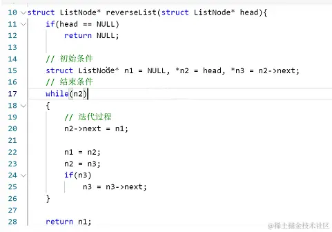 (1)定义并初始化这3个指针,定义*n1=NULL,*n2=head,*n3=n2->next;