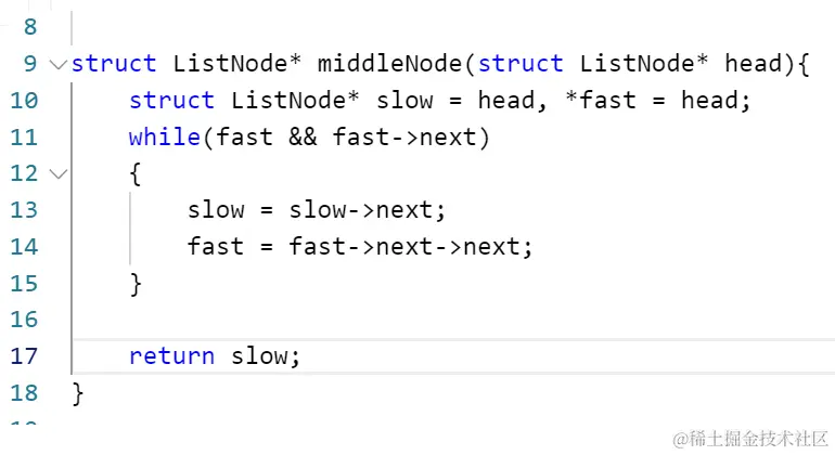 struct ListNode*slow=head,*fast=head;//定义快慢指针