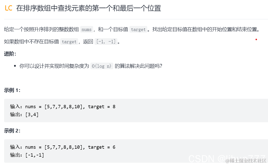 解析:看到这个时间复杂度和有序数组不难想到二分查找,再联系上文的总结:寻找左侧右侧区间即是元素的第一个和最后一个位置,注释已经写得很清楚了^ ^