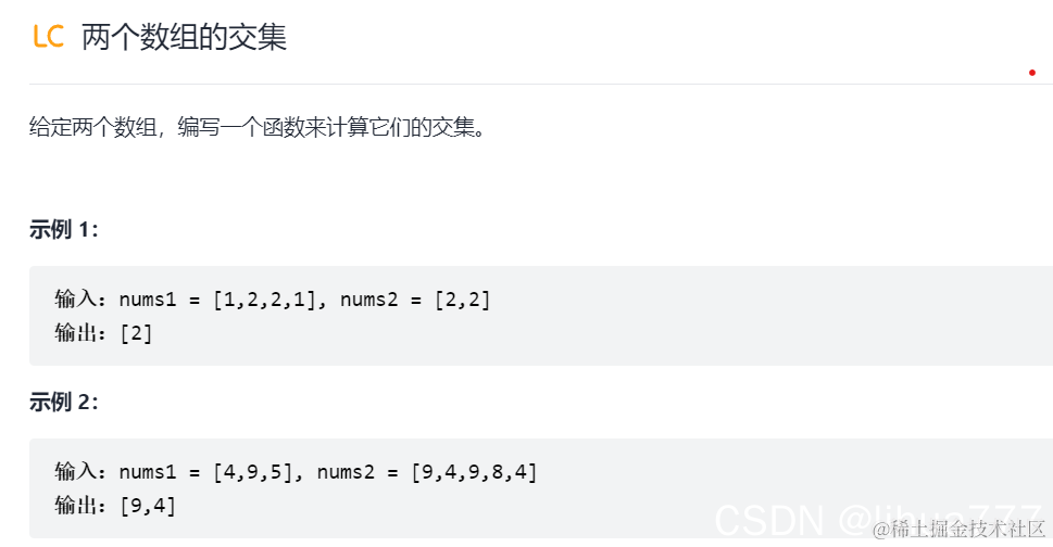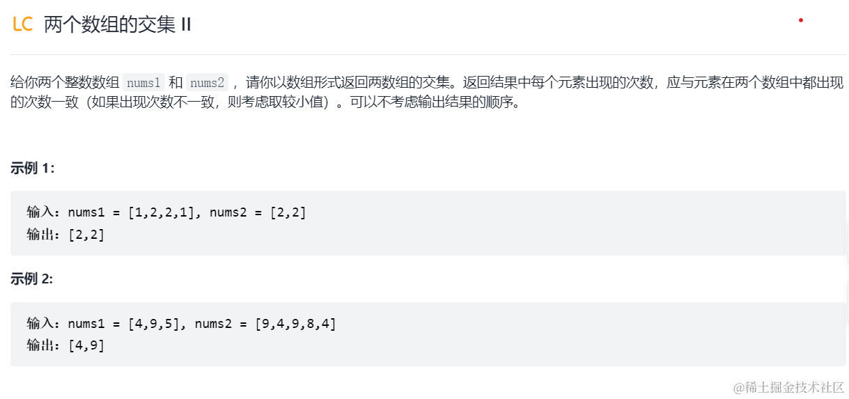 解析:上一题要求的只是交集,这道题是不仅是交集,还要要求返回2个数组中出现该重复元素的最少次数比如nums1=[2,2,2,2] nums[2]=[2,2,2] 返回ans=[2,2,2],这下你应该懂题目意思了吧