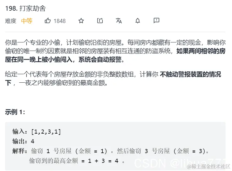 (1)当只有一个房屋时,最大金额就是这个了,即:maxprofit=nums[0]