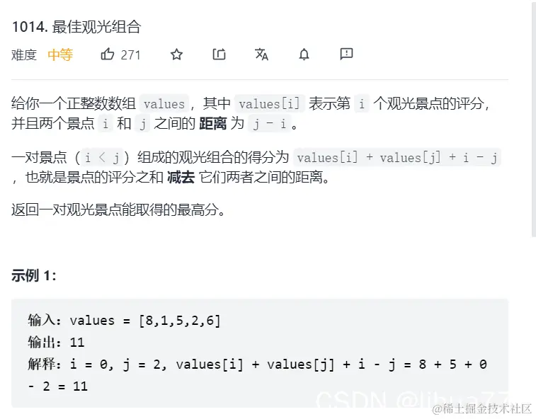 题目要求的是:values[i]+values[j]+i-j的最大值