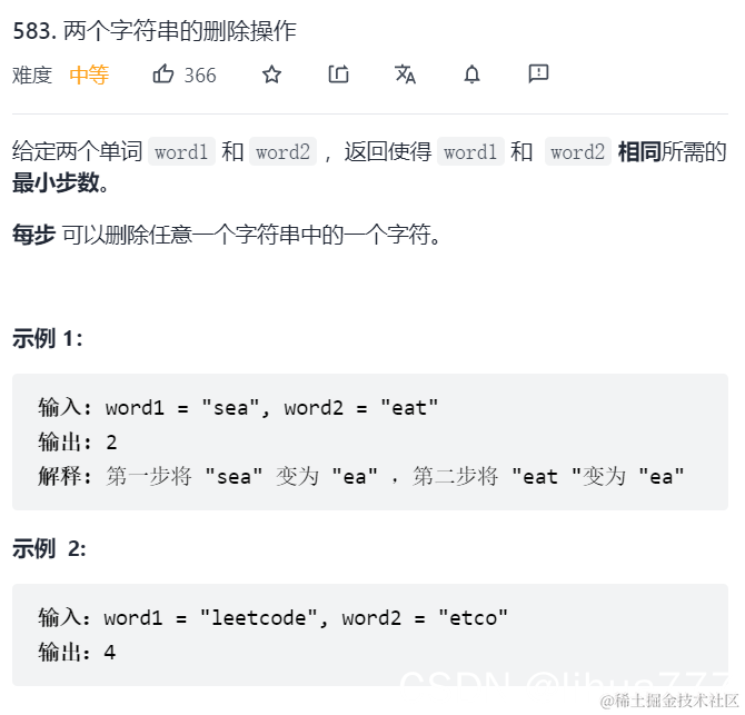(1)dp[i][j]:以i-1为结尾的字符串word1,和以j-1位结尾的字符串word2,想要达到相等,所需要删除元素的最少次数