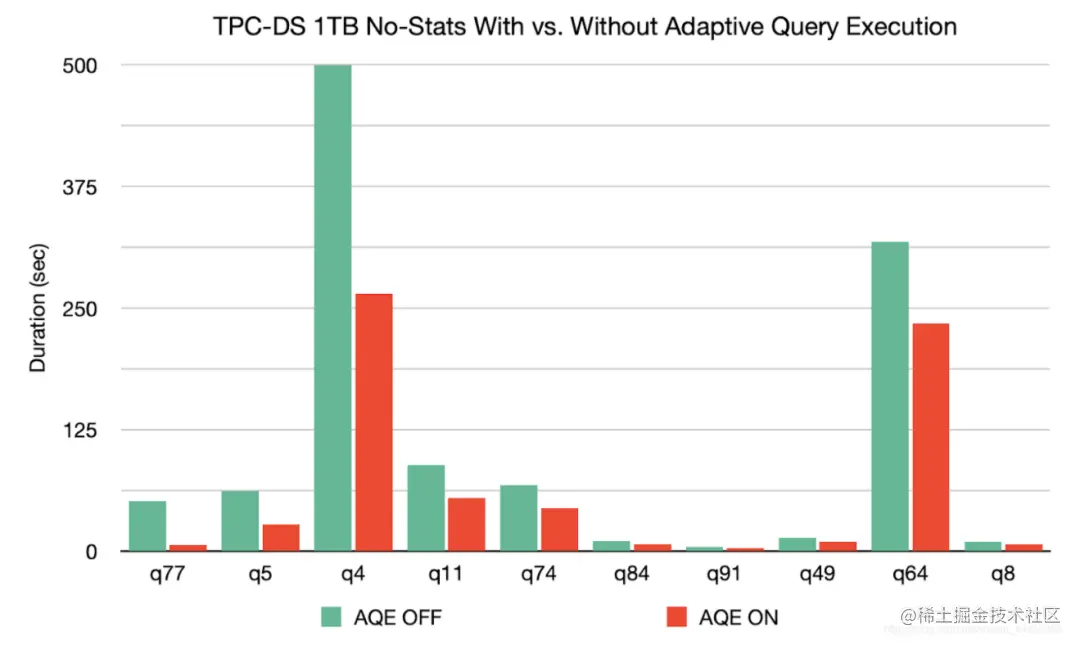 基于没有统计数据的 1TB TPC-DS 基准,Spark 3.0 可以使 q77 的速度提高8倍,使 q5 的速度提高2倍,而对另外26个查询的速度提高1.1倍以上。可以通过设置 SQL 配置 spark.sql.adaptive=true 来启用 AQE,这个参数默认值为 false
