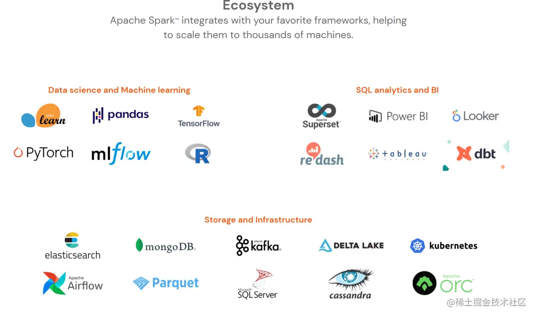 Apache spark 是一个用于大规模数据处理的一站式分析引擎。它提供了 java、 scala、 python 和 r 的高级 api,同时支持图计算。它还支持一系列丰富的高级工具,包括 sql 和结构化数据处理的 spark sql、机器学习的 mllib、图形处理的 graphx 以及增量计算和流处理的结构化流。近10余年的发展,已经形成了一个庞大的生态,包括开源的数据湖解决方案Delta Lake,也将Spark作为核心计算引擎。