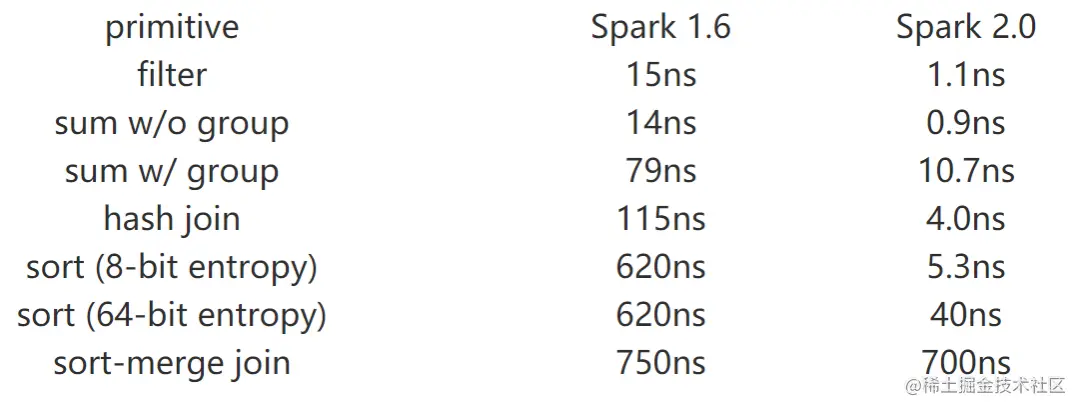 在Spark2.0中,首先是发起了一个名为“Tungsten”的项目,主攻Spark1.0中内存管理、 内存优化的问题。“Tungsten engine”是建立在现代编译器和MPP数据库上的想法,主要是通过运行期间优化那些拖慢整个查询的代码到一个单独的函数中,消除虚拟函数的调用以及利用CPU寄存器来存放中间数据,下图是Spark1.6和Spark2.0在一个核上处理一行的操作时间(单位:纳秒)