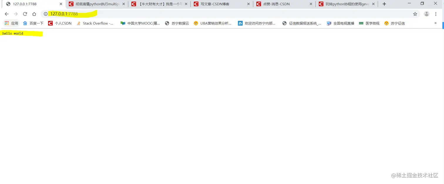 使用浏览器基于HTTP协议访问该服务器如下,服务器将固定返回基于http协议格式的hello,world给所有的请求者。这里因为浏览器可以解析http协议的格式文件,所以可以通过网页的形式展示出来hello,world。当然如果浏览器返回一个完整的网页,那么同样浏览器也可以解析整个网页,这就是我们日常使用的服务器与浏览器基于http协议的通信啦。