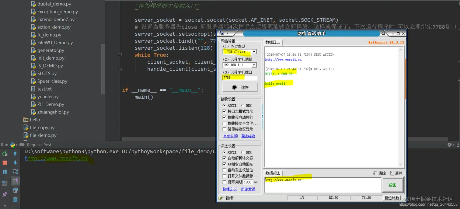 使用“网路调试助手"作为TCP 客户端发送请求给服务器, 服务器将固定返回基于http协议格式的hello,world给所有的请求者。