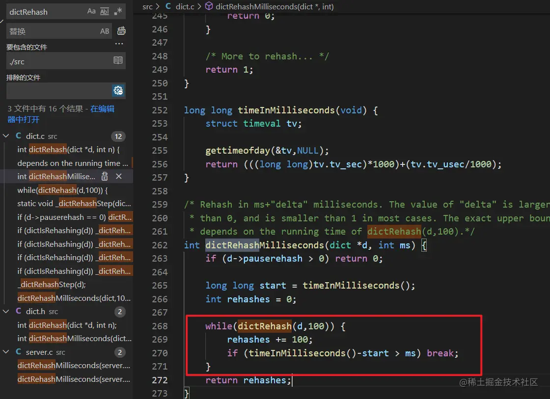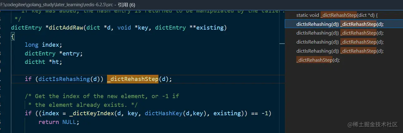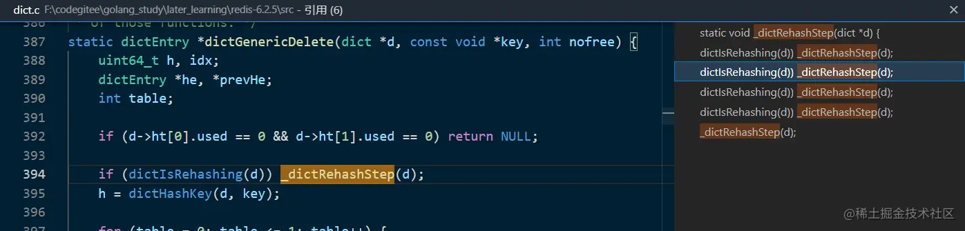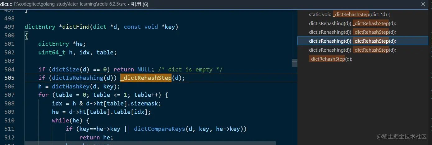 我们可以在 redis 源码中搜索使用 dictRehash 函数的位置