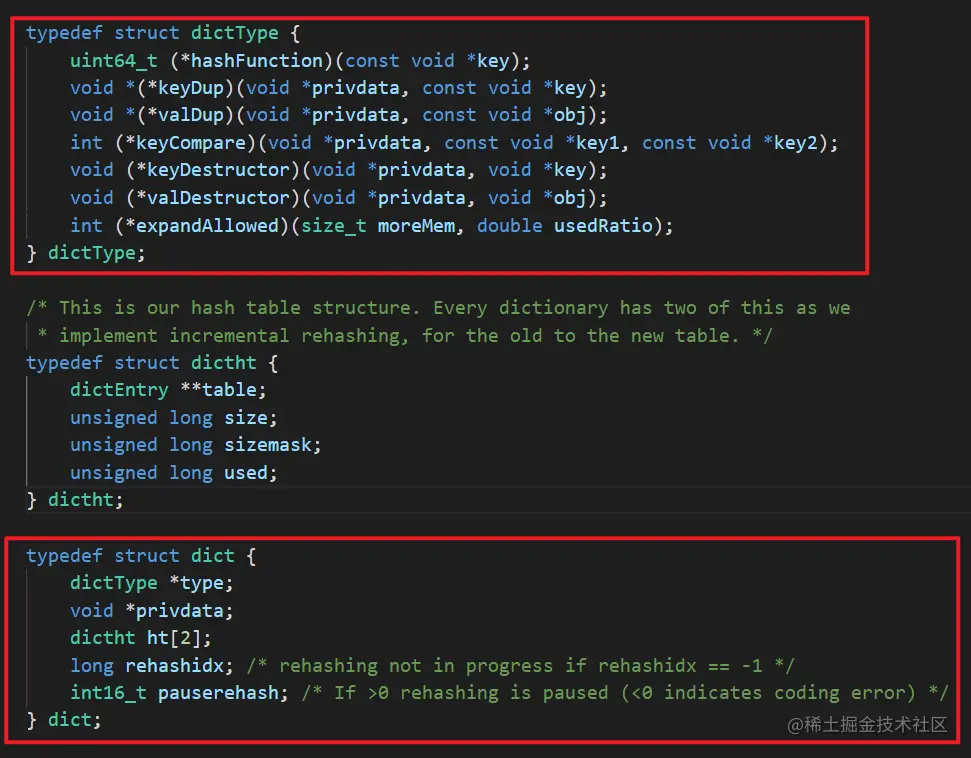 在 src\dict.h 文件中,咱们接着往下看,能够看到一个非常关键的结构,就是 dict ,redis 中都是使用这个结构来进行组织的