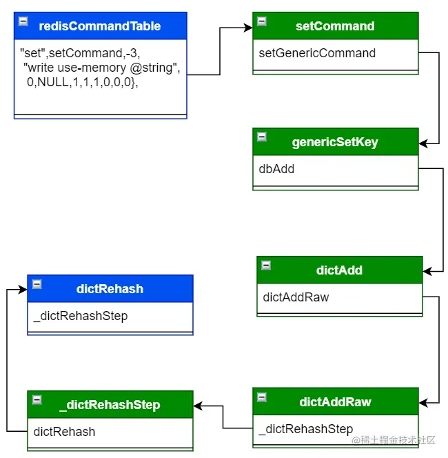 可以追一下代码流程 , 我们从 src\server.c 注册 setCommand 命令开始追起,代码设计关键流程如下