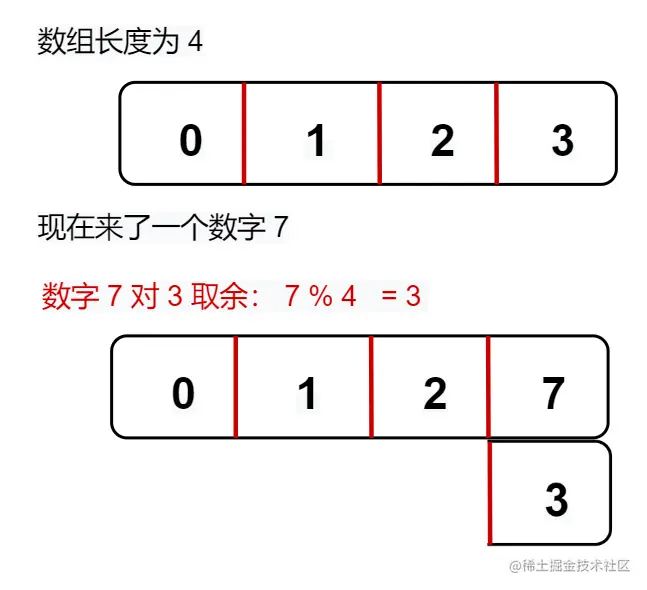 如图就很明确了, size = 4,sizemask = 3,hash 值为 7, 最后 hash 值 & sizemask = 0011, 也就是 3,因此就会插入到上图的具体位置